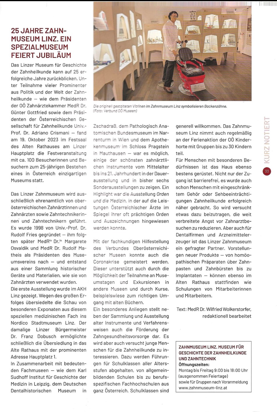 MR. Dr. Wilfried Wolkerstorfer, PM.ME Facharzt für Zahnheilkunde, Kustos des Linzer Museums für Geschichte der Zahnheilkunde Linz, Jänner 2024